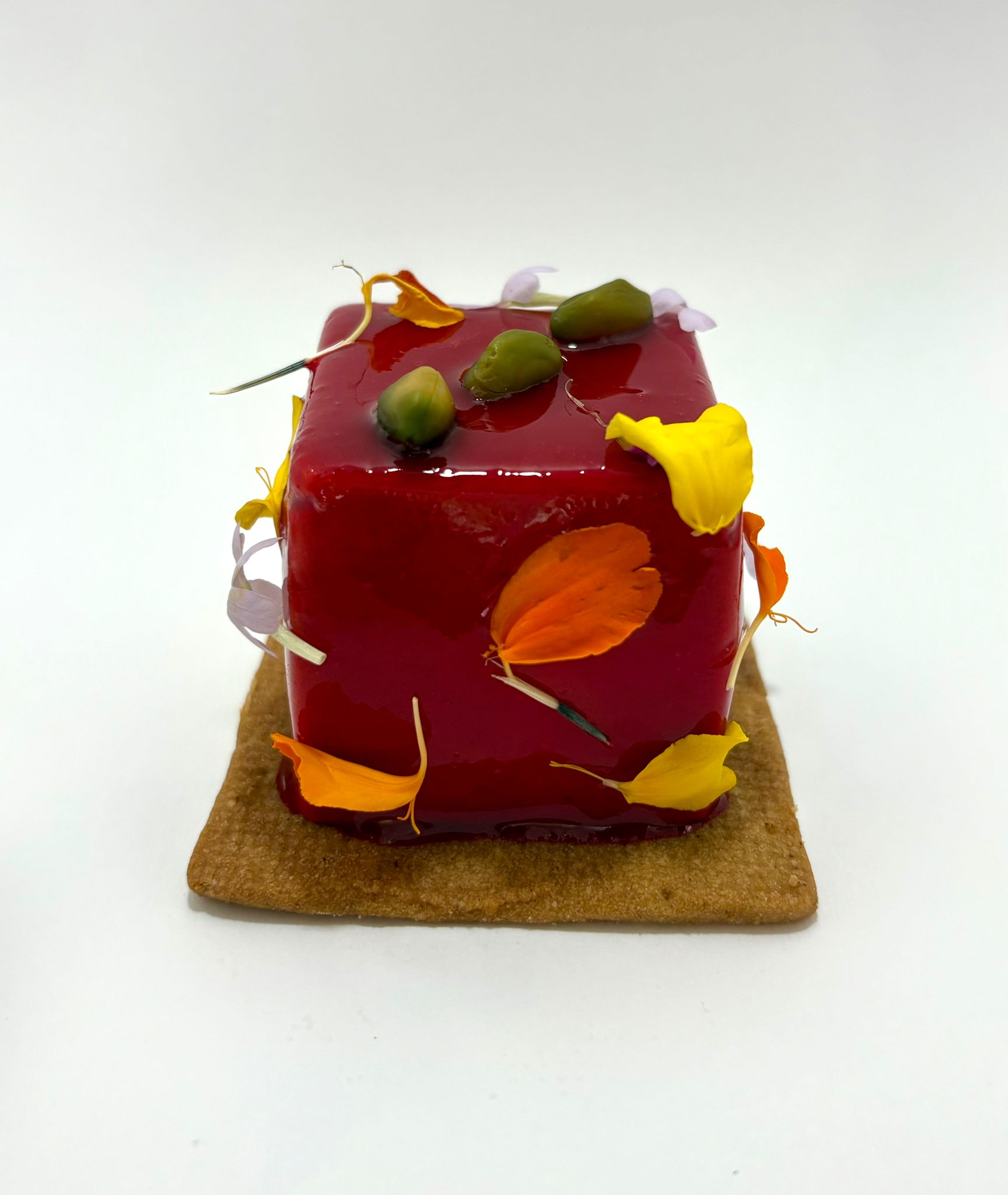 Ganache montée pistache, confit de framboise, biscuit madeleine, glaçage framboise, sablé amande.