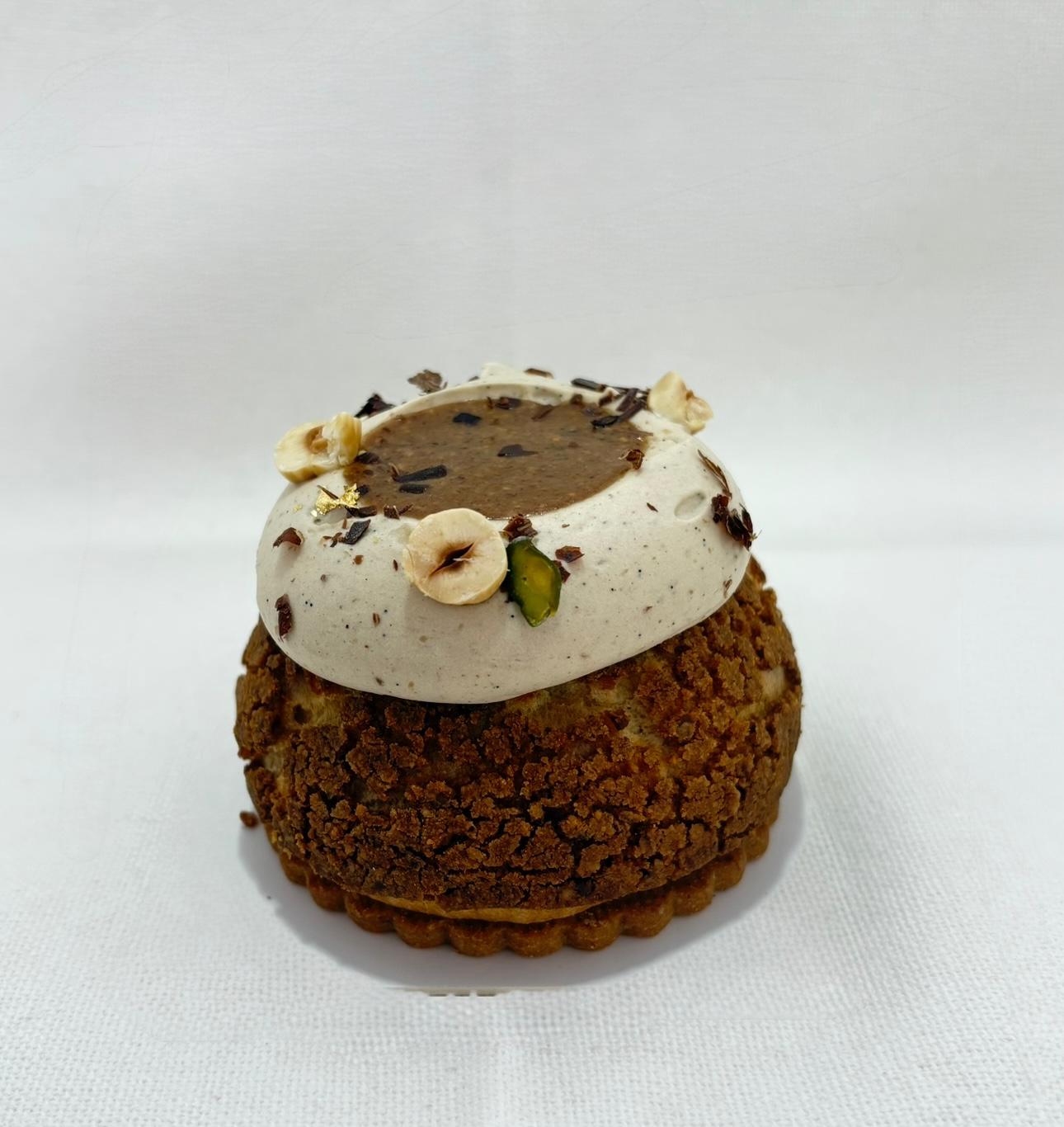 Pâte à choux, sablé amande, crème légère noisette, praliné amande noisette.